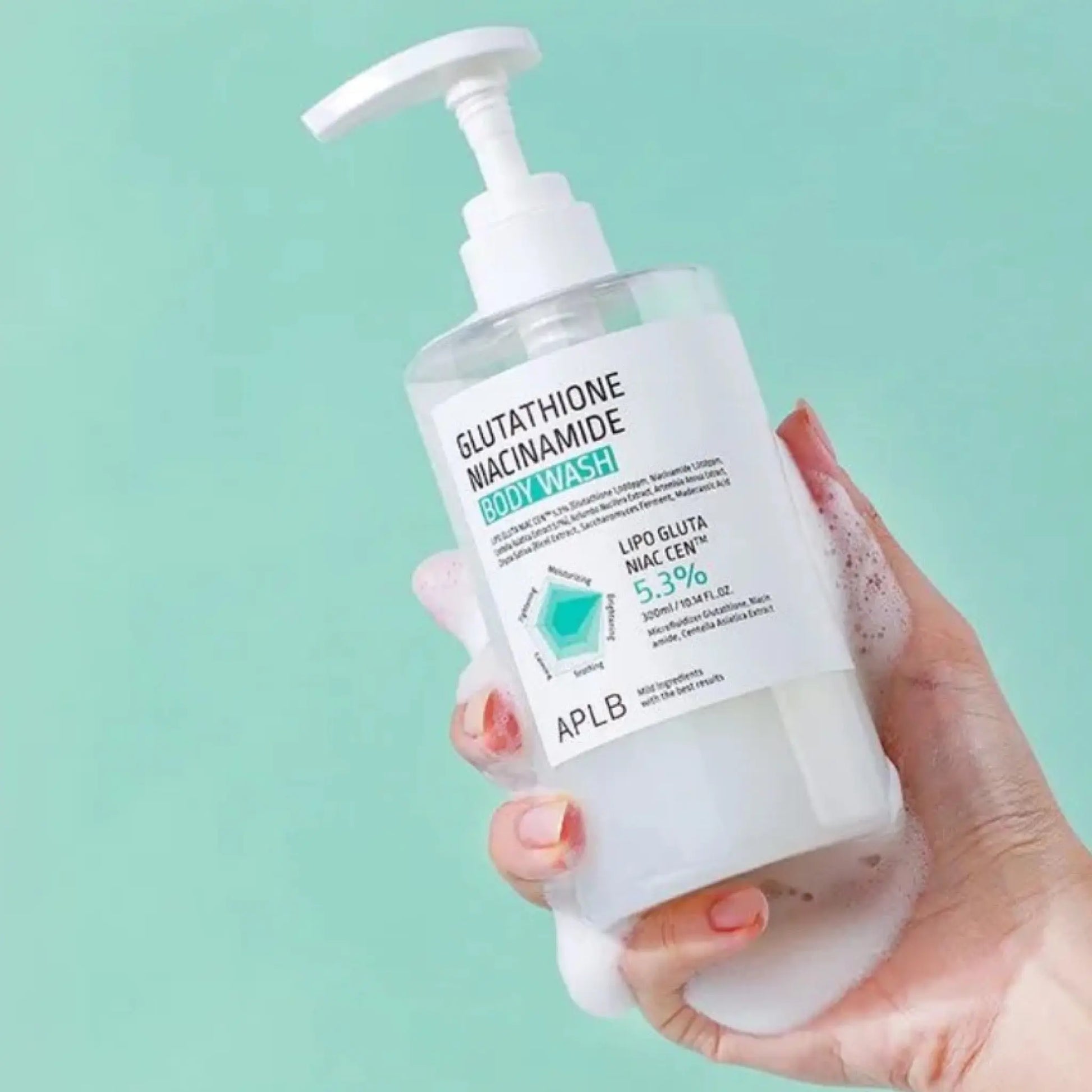 APLB Glutathione Niacinamide Body Wash غسول مفتح للجسم بالجلوتاثيون والنياسينمايد مضاد للحساسية. ينظف البشرة من الأوساخ والشوائب، ويمنحها عناية مُشرقة بفضل مكوناته. صُمم بتركيبة غنية بحمض الهيالورونيك وبيتا جلوكان لتعزيز ترطيب البشرة.